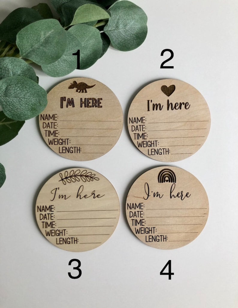 I'm Here Birth Stat Disc | Wooden Baby Statistic Sign | Birth Weight Sign